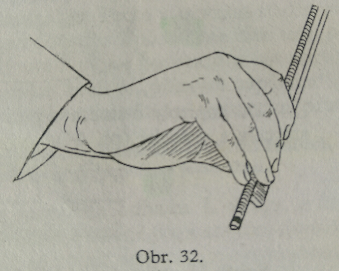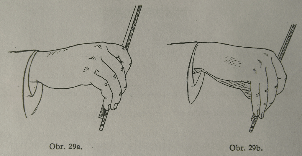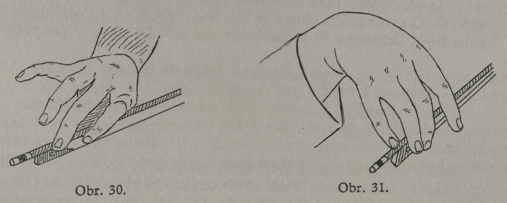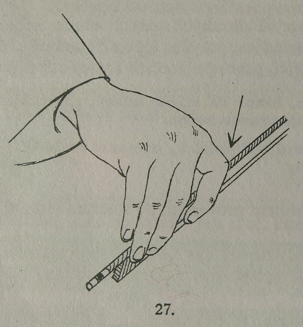 Para asegurar la presión sobre la vara, estudiamos el staccato en serie en la parte superior del arco también levantando el meñique y el anular (ver imagen 30 más adelante); si levantamos también el codo (tocamos la vara con la tercera articulación del dedo índice), llevaremos la mano a una posición inclinada, de la que los dedos se puedan mover más directamente, con menos esfuerzo y por ello con movimientos más fáciles.