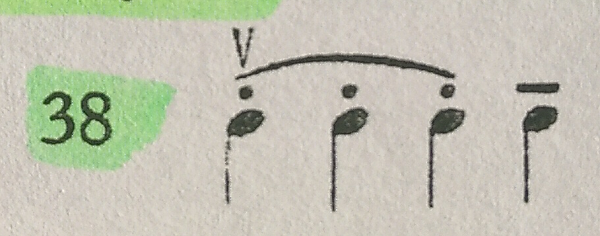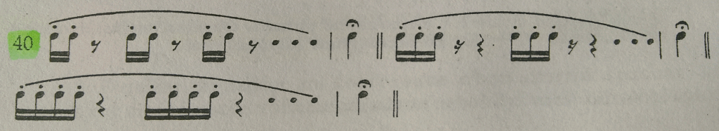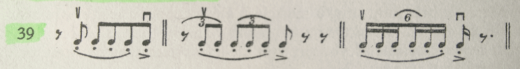 Las series de staccatos, ya sean arco abajo o arco arriba, las estudiamos también en grupos de dos, tres, cuatro y varias notas en un mismo sentido (ejemplo 40); volvemos al punto de partida del arco con un simple tono largo con calderón encima.