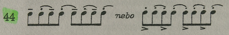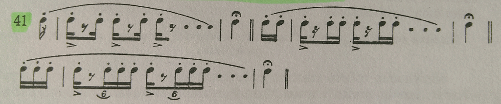 Para obtener mayor velocidad en cada uno de los grupos, nos ayudamos acentuando las últimas notas de cada grupito cada vez de alguna forma diferente (ejemplo 41). En la pausa mantenemos el arco bajo tensión.