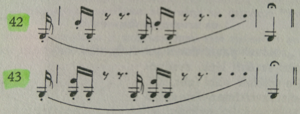 Al final, cambiamos el orden de las cuerdas (ejemplo 42). Aquí es necesario prestar atención para que los movimientos plegados del arco sean lo más bajos posible, eventualmente, estudiamos los cambios de cuerda primero en forma de dobles cuerdas (ejemplo 43).